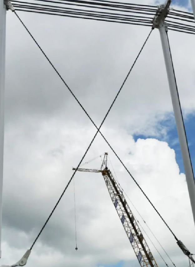 三亞體育場總建筑面積8.8萬余平米,體育場屋蓋為輪輻式索桁架結構,平面投影短軸224米、長軸261.8米,中心開口短軸134米,長軸171.8米。為提升結構抗風能力,屋蓋結構布置內環交叉索;為降低內環交叉索對鎖夾造成的不平衡力,該項目創新應用了強模比遠高于普通鋼索的CFRP平行板索,以新材料、新構件完美解決了結構問題。